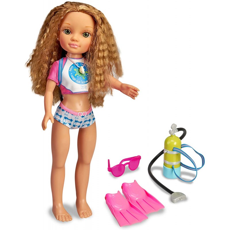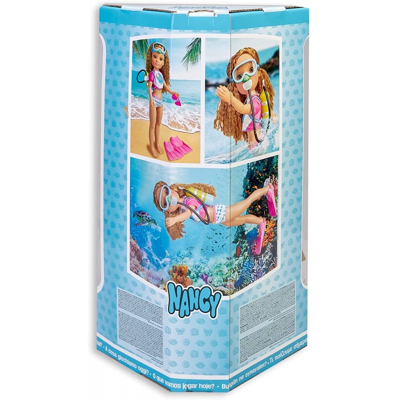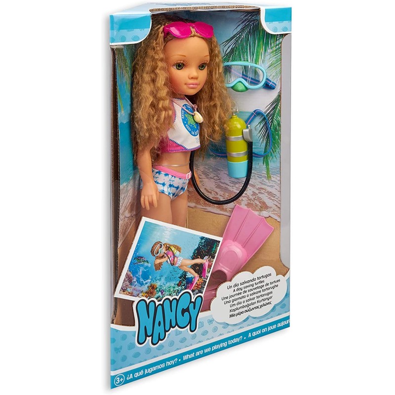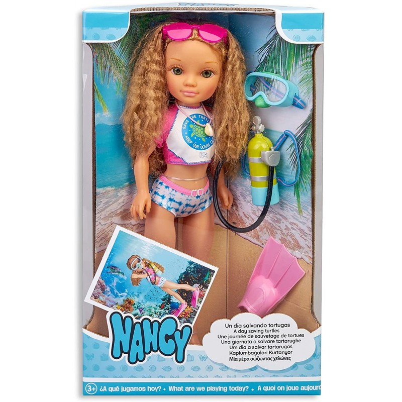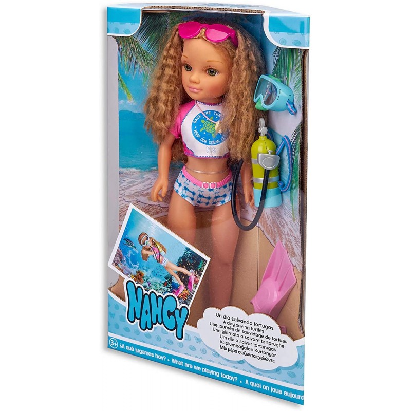 A las niñas les encantan los animales marinos, pasa, horas en el agua y las aventuras. Por ello Nancy está cada vez más concienciada con la ecología y salvar la fauna marina y viene preparada para pasa, horas de aventuras buceando y ayudando a sus amigas las tortugas. Nancy incluye un traje de baño dos piezas de neopreno y accesorios como gafas de bucear y de sol, aletas o bombona de oxígeno; todo lo necesario para crear aventuras. Además tiene una melena rizada y un bonito colgante de concha. Para regalar a las niñas a las que les gusta llevar a su muñeca a la piscina o a la playa para crear historias y aventuras acuáticas. Muñeca de 43 cm. Incluye sistema de drenaje para un mejor secado tras sumergirla en el agua.