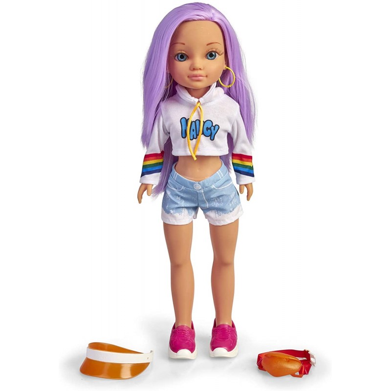 Nancy, un día de festival está lista para ir a pasar una divertida tarde con sus amigas, y lo hace con un look muy aspiracional. Nancy tiene el pelo de color morado y viste unos shorts vaqueros con una sudadera crop top, una riñonera y zapatillas de plataforma en tendencia.
