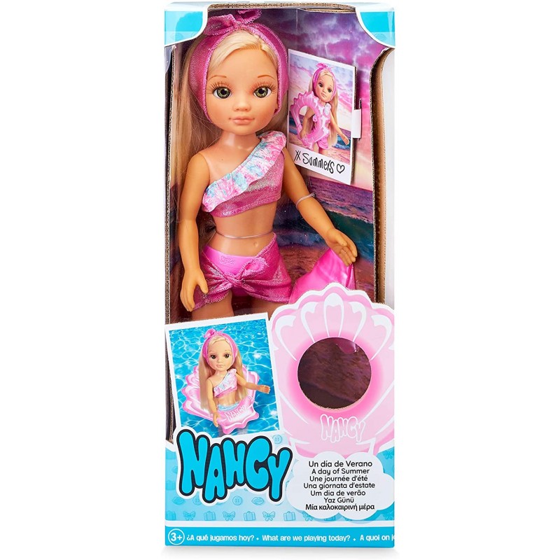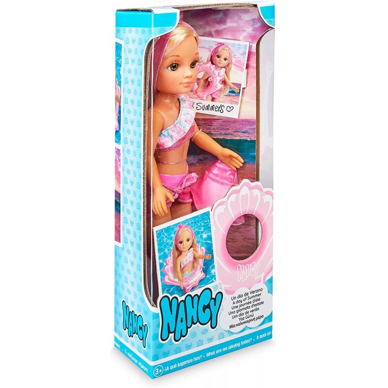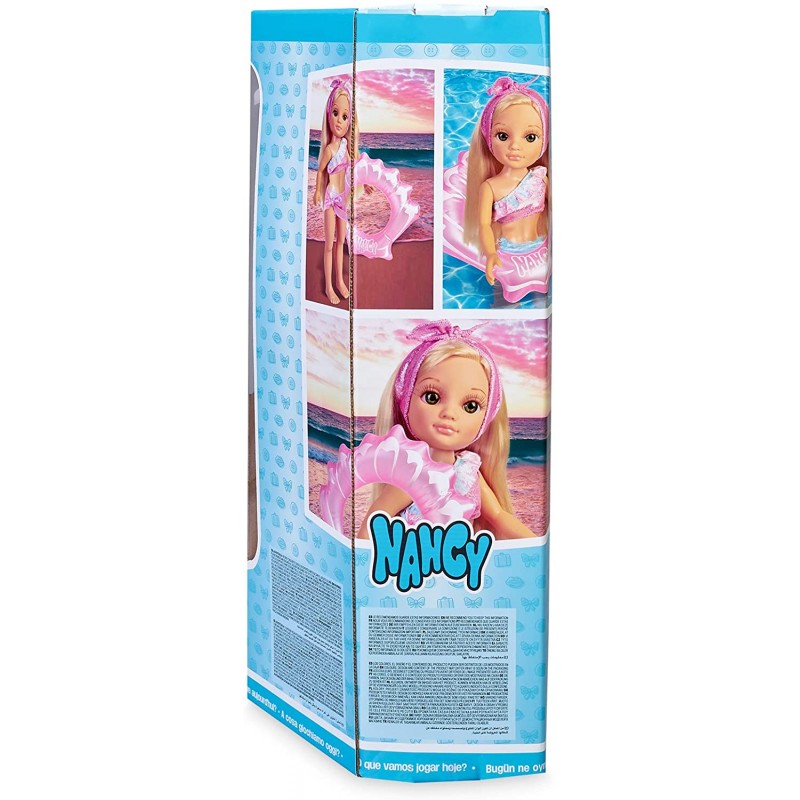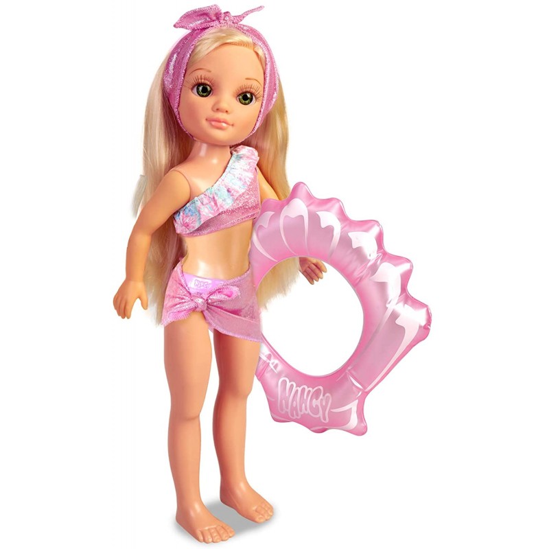 Nancy un día de verano está lista para divertirse con tu peque en la piscina o en el mar. Lleva un traje de baño rosa metalizado con volantes. Además tiene accesorios a juego como un pañuelo para el pelo o un pareo para completar su look veraniego. Para divertirse en el agua incluye flotador en forma de concha de color rosa perlado, el color del verano. Para regalar a las niñas a las que les gusta llevar a su muñeca a la piscina o a la playa para crear innumerable, historias y aventuras acuáticas. Muñeca de 43 cm. Incluye sistema de drenaje para un mejor secado tras sumergirla en el agua.