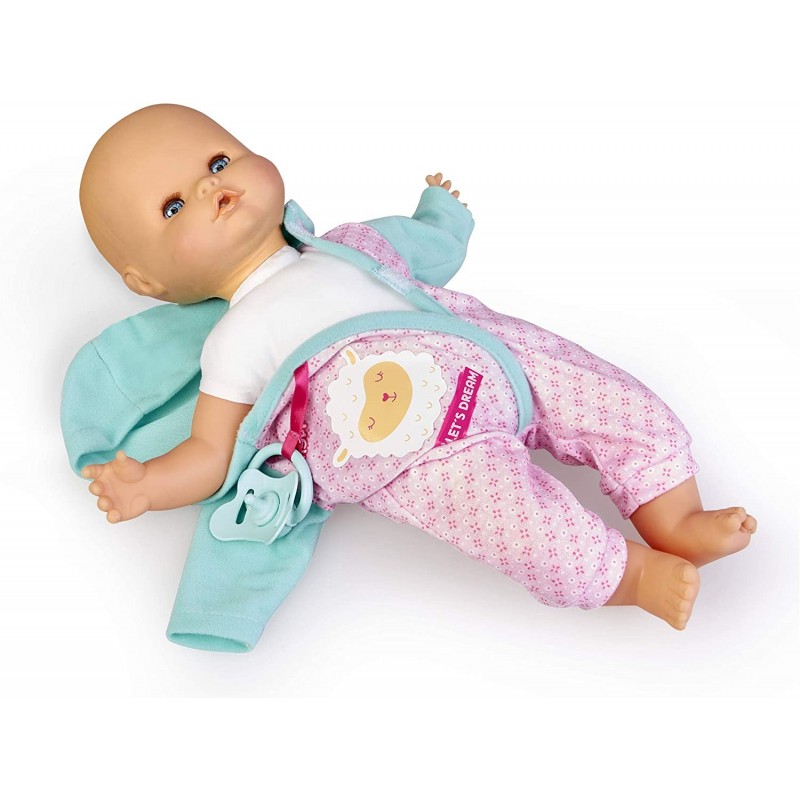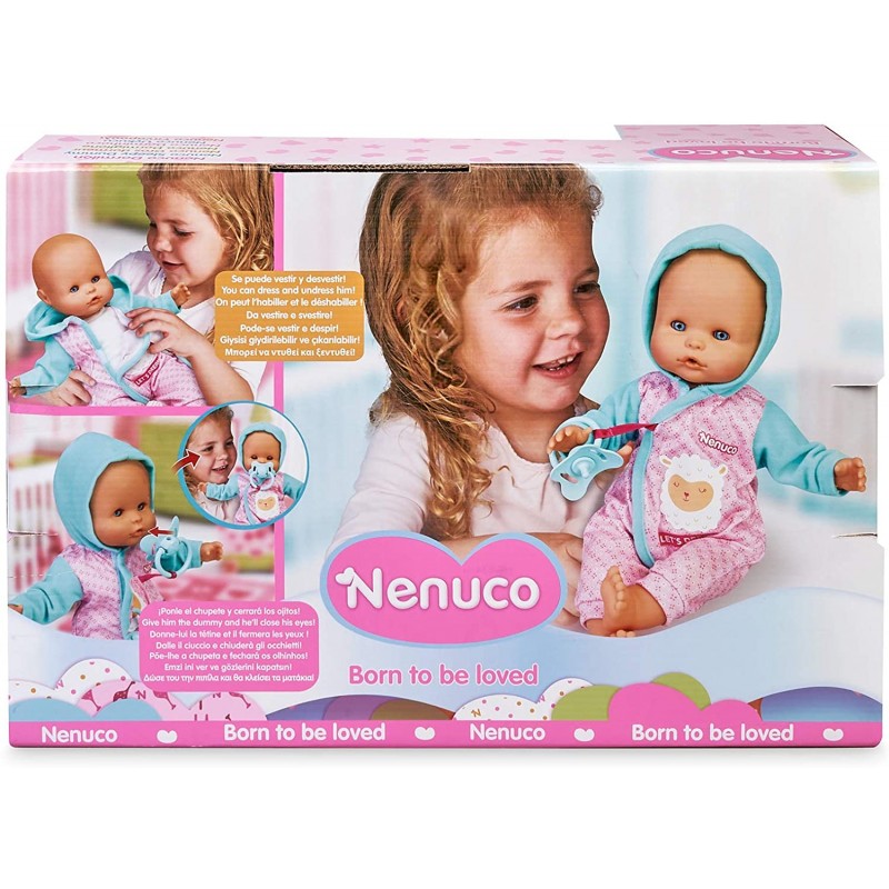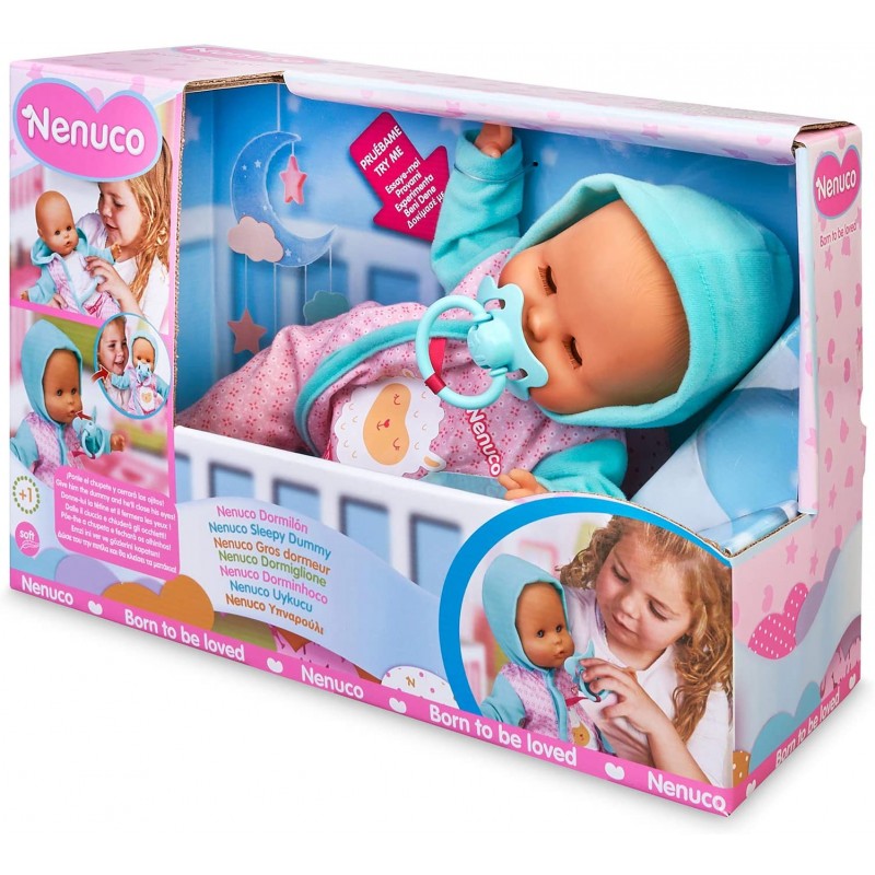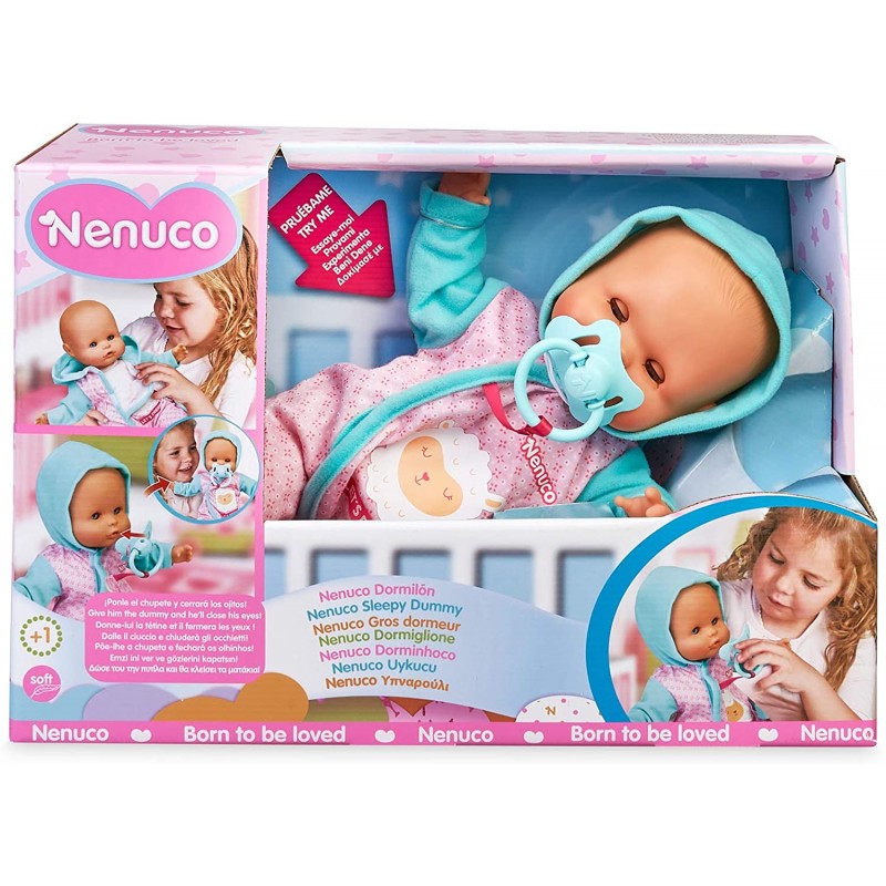 Nenuco Bebé Dormilón no puede irse a dormir sin su chupete. Cuando le pones a Nenuco su chupete cerrará los ojitos. Nenuco viste un pijamita azul con capucha