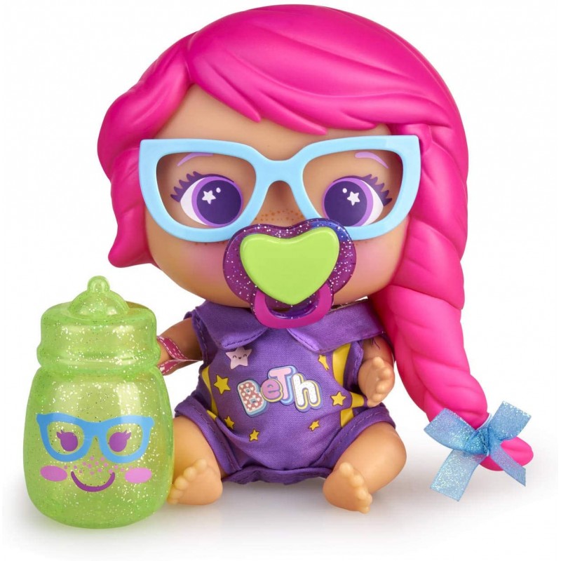 Bellie Beth es el Bellie más divertida y cute. Incluye un mono como el de Beth, la nanny más cool de los Bellies, que adoran los niños; y tiene una trenza rosa increíble. Como todos los Bellies, le suena el corazón, habla de una manera divertida, una marca de nacimiento, sorpresita en el pañal y su Bellypedia con Poopypedia. Incluye accesorios como unas gafas, un chupete, Bellypedia y un biberón con mucha purpurina.