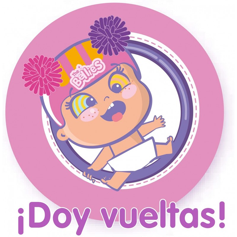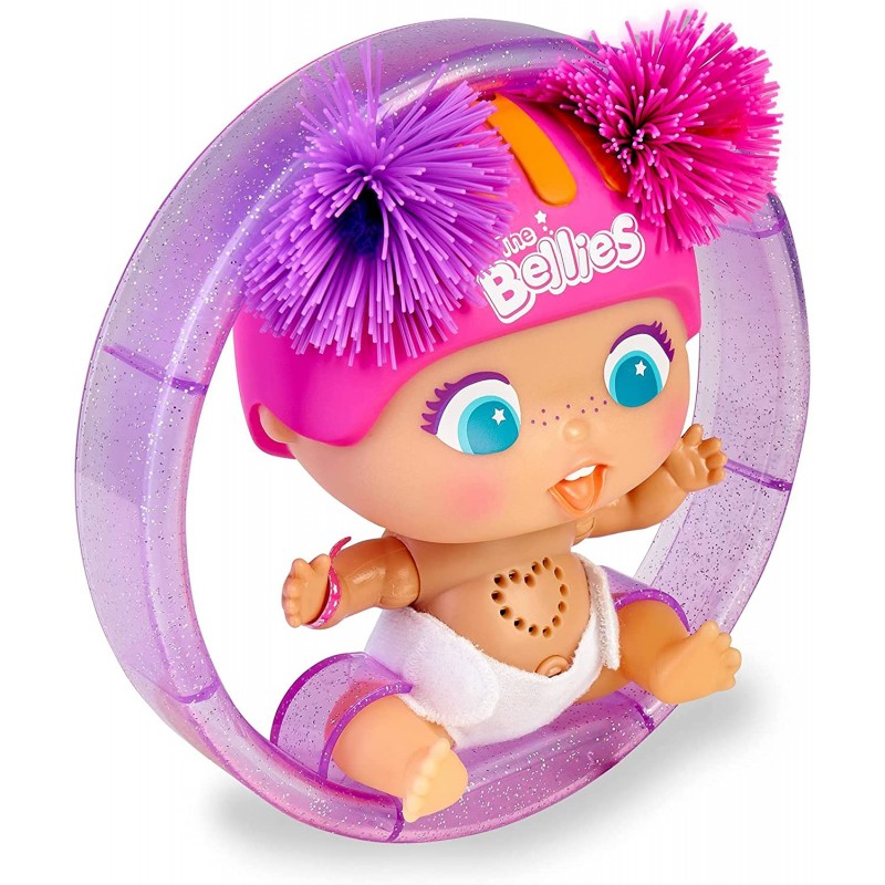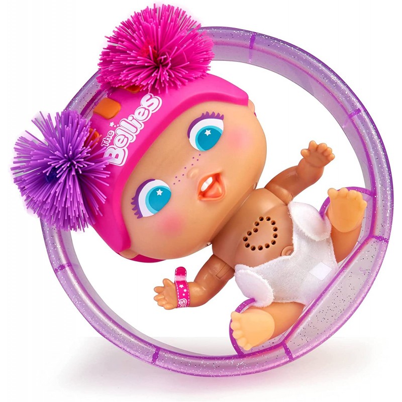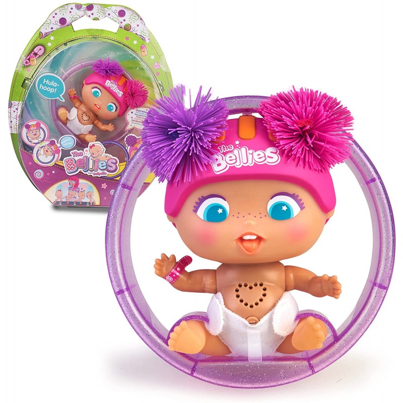 ¡Hula- hoop! Es una Bellie super divertida que incluye un aro morado! ¿Cómo funciona? ¡Solo pon a Hula-hoop! dentro del aro, tíralo y ella rodará y rodará. Hula-hoop! es una Bellie súper mona con un casco rosa y lazos.