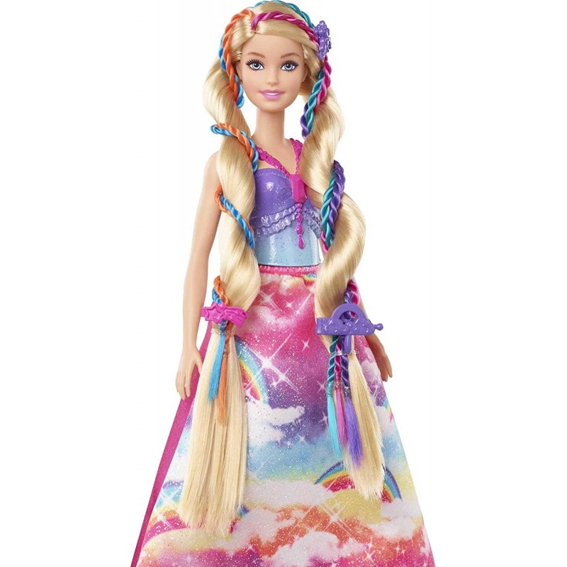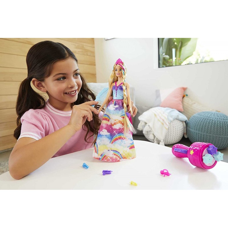 ¡Las jóvenes estilistas pueden crear el look de sus sueños con la muñeca princesa Dreamtopia Twist 'n Style™ de Barbie™! Esta muñeca princesa Barbie® tiene un pelo extralargo de 21,6 cm, extensiones de arcoíris que se pueden rizar y trenzar y una herramienta para que hacer peinados a la muñeca sea fácil y divertido. Peina el pelo de la muñeca Barbie®, coloca dos o tres cuentas para el pelo en la herramienta para peinar y crea peinados fantásticos con tan solo pulsar un botón. Personaliza el aspecto de la princesa Barbie® con pasadores de colores y una tiara. ¡Así estará lista para una aventura mágica! Con tantas oportunidades para contar historias y crear peinados, la muñeca princesa Dreamtopia Twist 'n Style™ de Barbie™ es un gran regalo para las amantes de cuentos de hadas a partir de 3 años. La muñeca no puede tenerse en pie por sí sola. Los colores y la decoración pueden ser distintos de los mostrados.