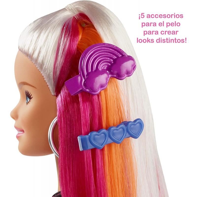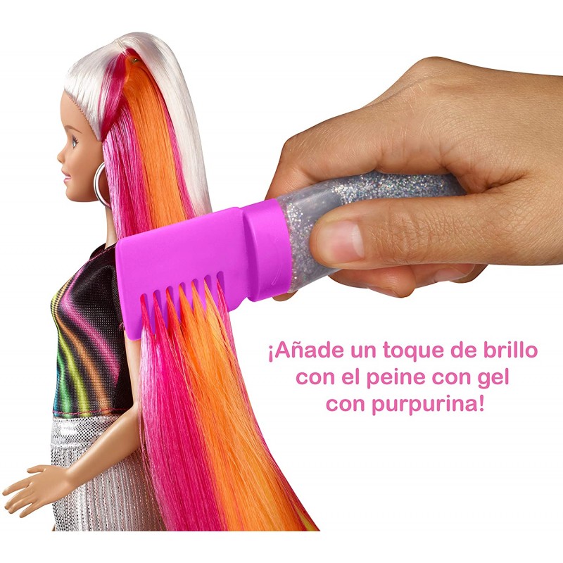 ¡La muñeca articulada Barbie Mechas Arcoíris iluminará la imaginación de los niños para diseñar peinados únicos con gel con purpurina, accesorios para el pelo y funciones impresionantes!