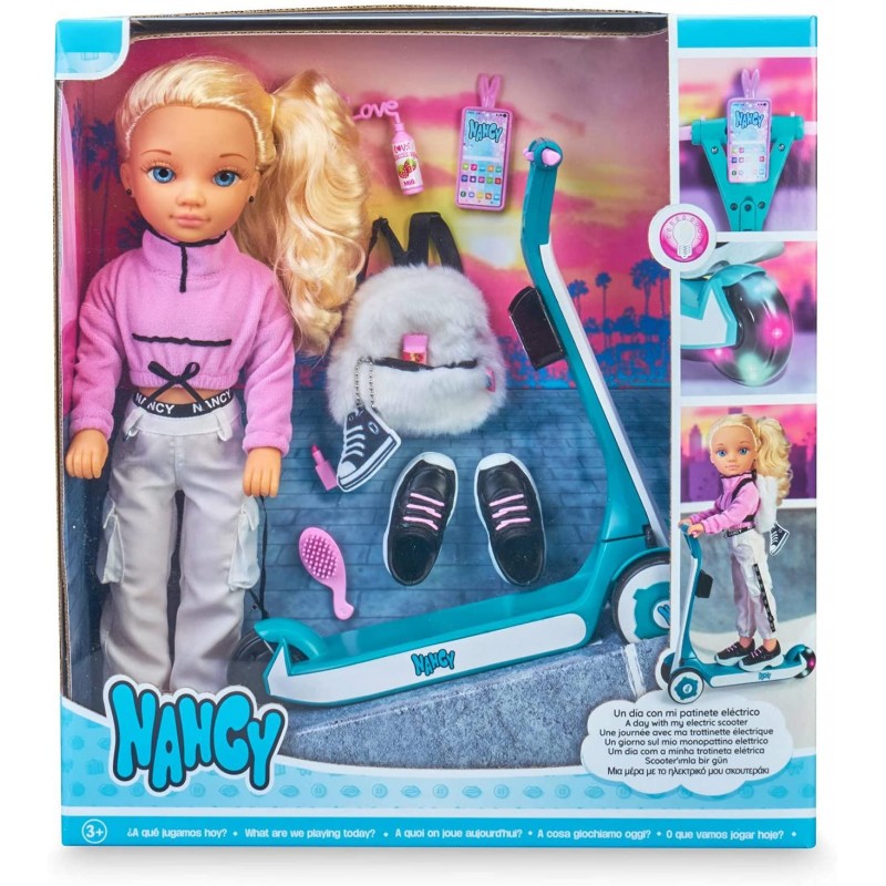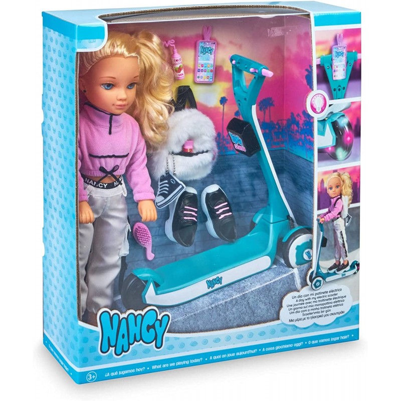 Nancy - Un día con patinete, Muñeca con patinete, tiene luces en las ruedas, ropa muy cool y accesorios para llevar en su mochila, para niñas y niños a partir de 3 años, Famosa