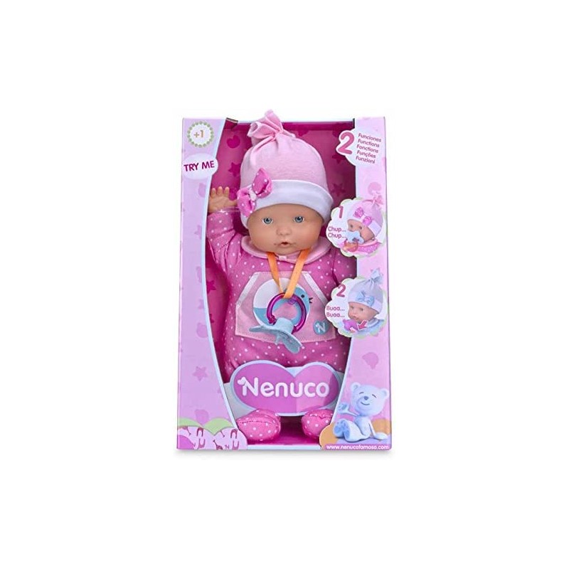Con el nenuco Soft recién nacido, la niña ocupa muy a corazón su función de apprentie mamá. Este muñeco al cuerpo flexible de 30 cm sabe chupar su tetina pero llora lorsquon la le retira. También puede chupar su pulgar como un bebé de verdad. Requiere 3 pilas l r44 (incluidas). Disponible en 2 modelos: rosa y Azul.