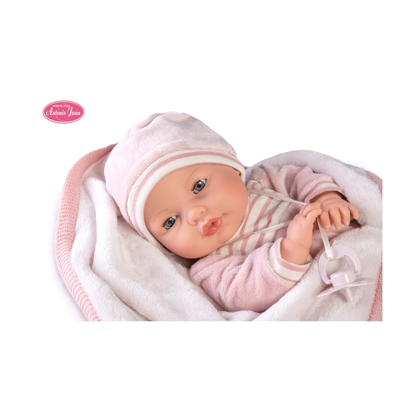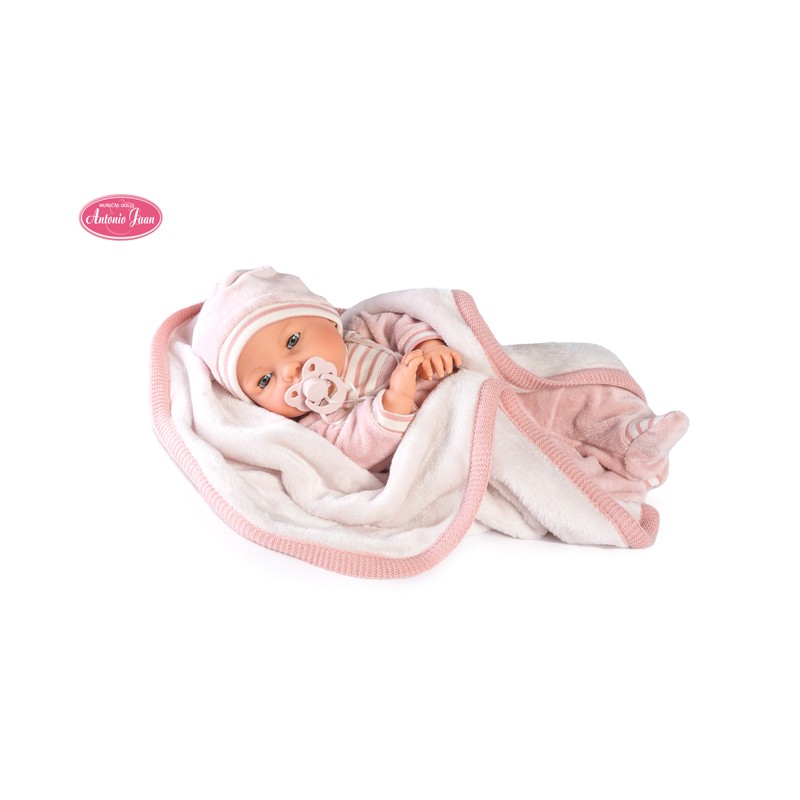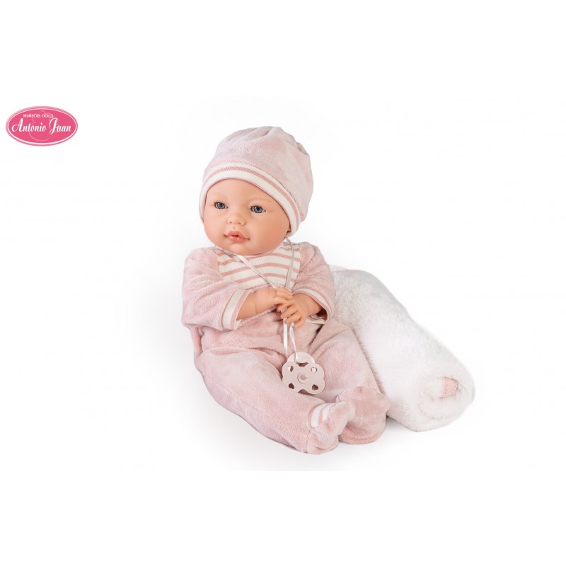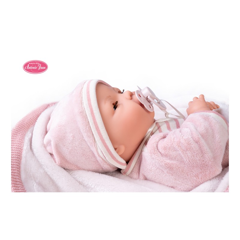 ¡Qué calentita está Bimba con la mantita de invierno! Lleva un suave pijama a juego con el gorrito. Si la acuestas cerrará sus ojitos y se dormirá tranquilamente. Bimba es una muñeca con mecanismo de sonido de Muñecas Antonio Juan. Al quitarle el chupete llora y llama a sus papás, pero si le pones el chupete se tranquilizará. Tiene el cuerpo de tela blandito para que le puedas dar abrazos y las extremidades de suave vinilo. Mide 37 cm y pesa 430 gr. ¡Bimba está deseando que la cojas en brazos para cerrar sus ojos y dormir un ratito!