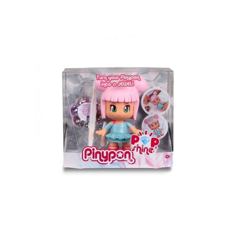 Figura Pinypon de 17 cm para personalizar y decorar tu gusto. Incluye más de 500 cristales de 7 colores diferentes para decorar la figura. Con un bolígrafo especial de pegamento para pegar los brillantitos y un recambio de pegamento. La figura tiene el pelo rosa con moñitos, camiseta rosa y falda azul.