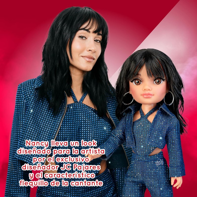 Nancy tiene el mismo peinado que Aitana, con melena oscura, corte a capas y su icónico flequillo, además de su característico maquillaje. Estos detalles realzan la semejanza con la cantante, creando una auténtica réplica.