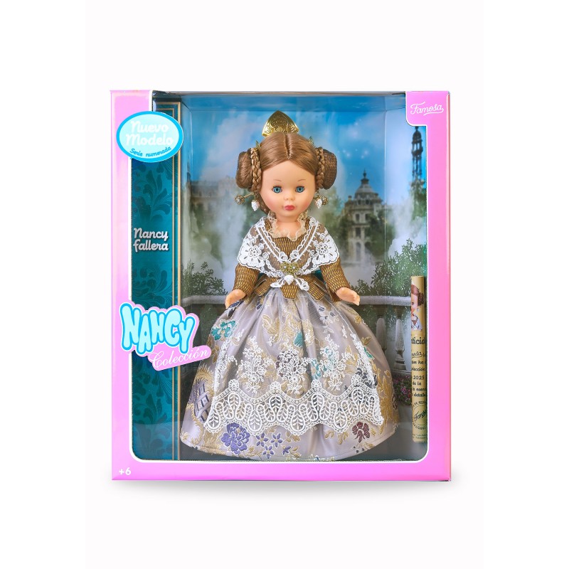 Nancy Colección Fallera Edición 2025 viste un auténtico traje regional de la Comunidad Valenciana, capturando la esencia de la indumentaria fallera en cada detalle.