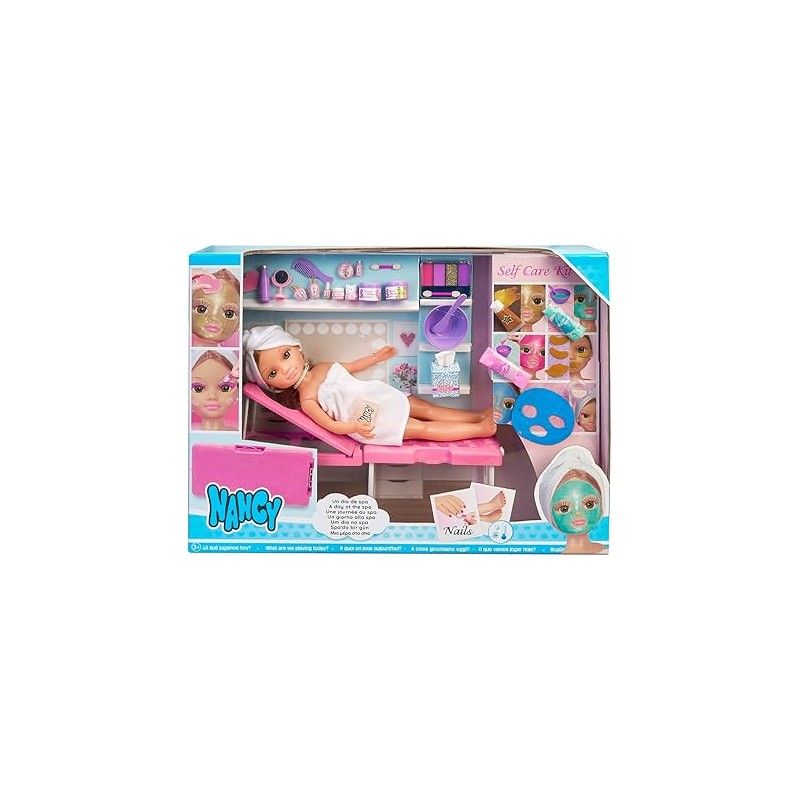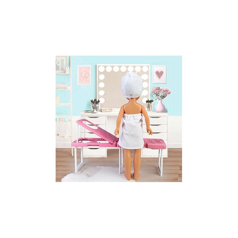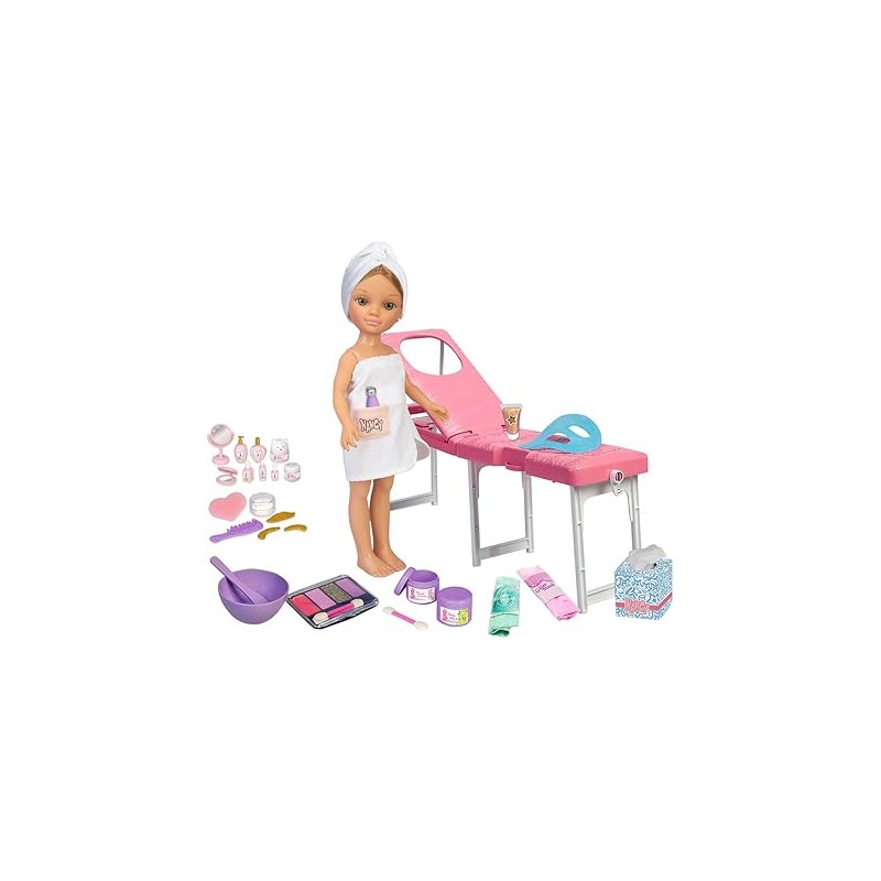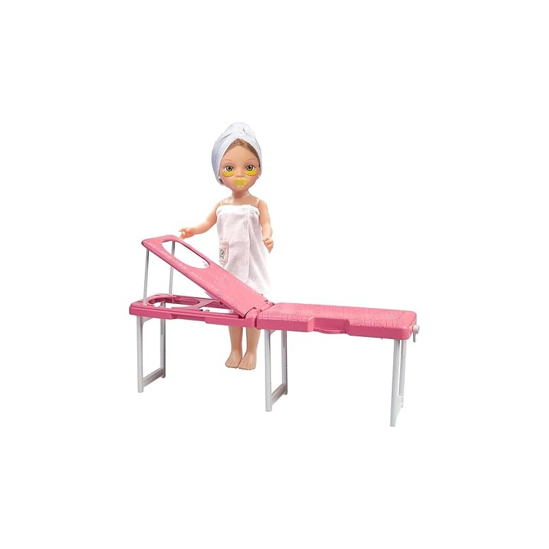 - Incluye una muñeca de 42 centímetros castaña y de ojos verdes vestida con una toalla de cuerpo y de pelo para hacerse su tratamiento en el spa