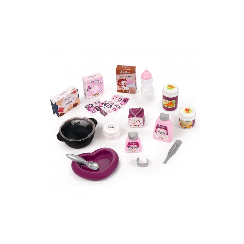 La casa tiene muchos accesorios para complementar las funciones de juego: 1 biberón, cajas de fetiche, botellas, 1 olla, 1 plato, 1 cuchara, 1 ducha y 1 pulsera