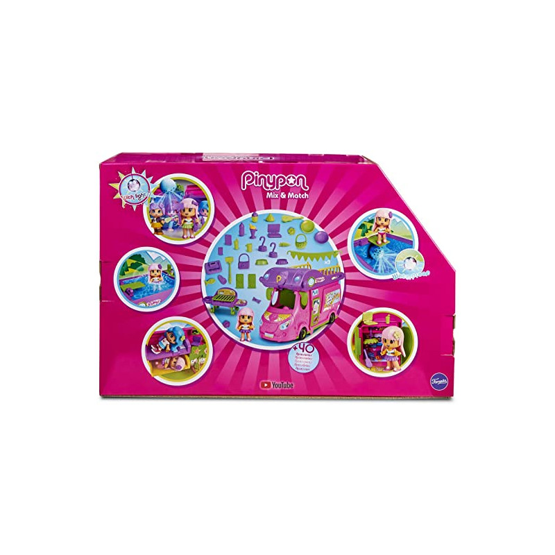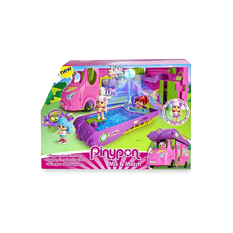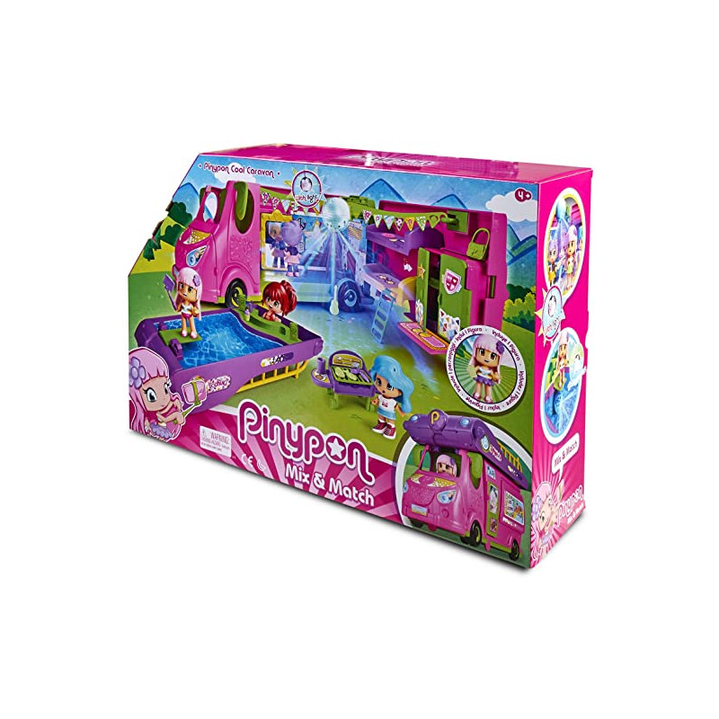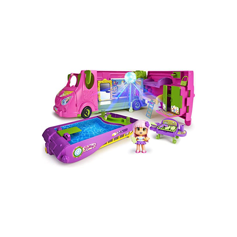 La nueva caravana de pinypon tiene todo lo necesario y mucho más; el techo de la caravana se convierte en la piscina más cool, tiene luces que cambian de color. La caravana; estando cerrada mide 35 x 16 x 15cm de alto; para cenar, barbacoa al aire libre, y después, todas a bailar bajo la bola de discoteca con luces de verdad; la caravana es muy completa por dentro; con 2 camas literas; área de cuarto de baño; mesita para su portátil; y 2 grandes armarios; incluye caravana (vehículo y casa portátil), piscina, armario,. 2 camas, barbacoa, mesa, guirnalda, bola de discoteca con luz real, figura y más de 50; accesorios; todos los accesorios vienen dentro de bolsitas para fomentar la experiencia de unboxing y sorpresa.